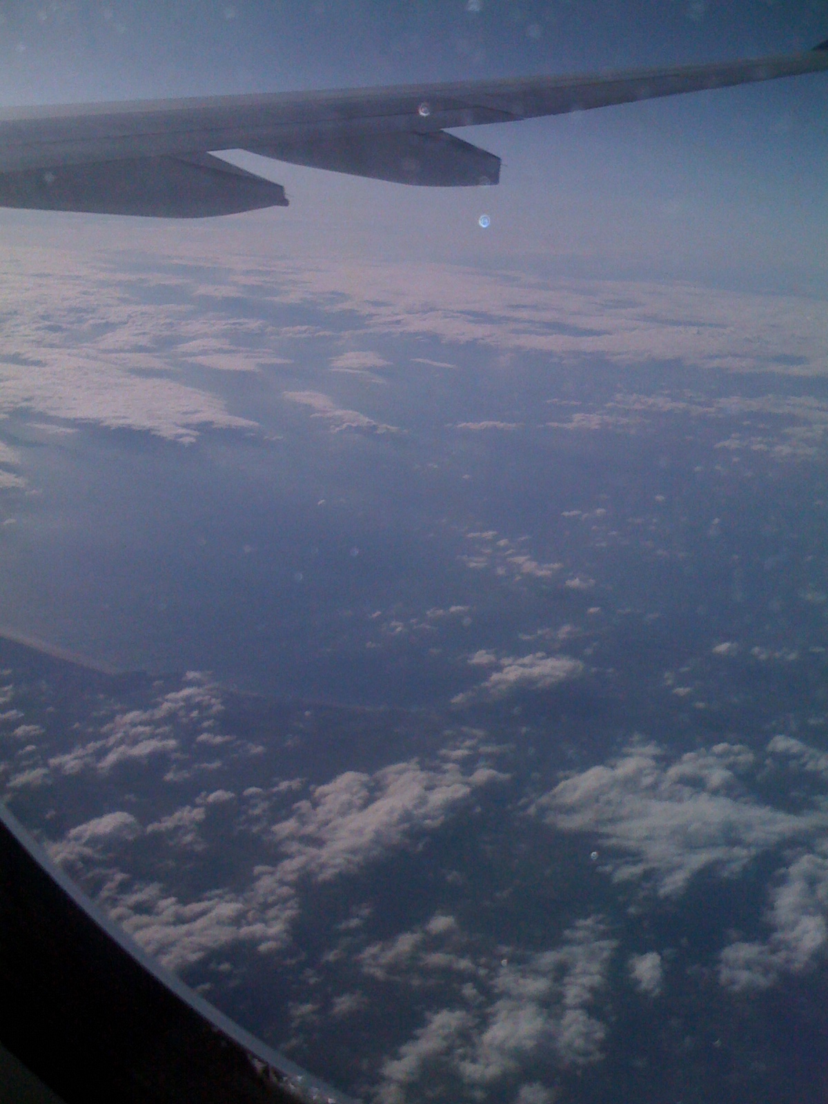 De haut on voyait pas grand chose (la nuit), sauf en arrivant, beaucoup de nuages. Pendant le vol, on a eu droit à de la bouffe (pâtes), qui étaient franchement très bien (comme un repas congelé), contrairement au « pas mangeable » qu’on nous avait dit. Pâtes, et un muffin plus tard.