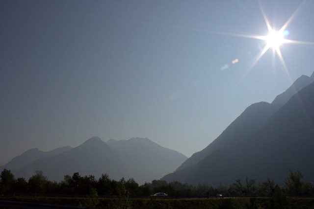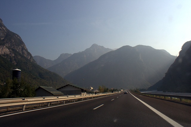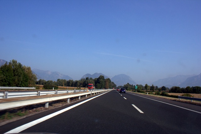 Déjà très tôt (encore en Italie), on voit au loin une belle chaîne de montagnes. Pas trop habitués de voir ça.