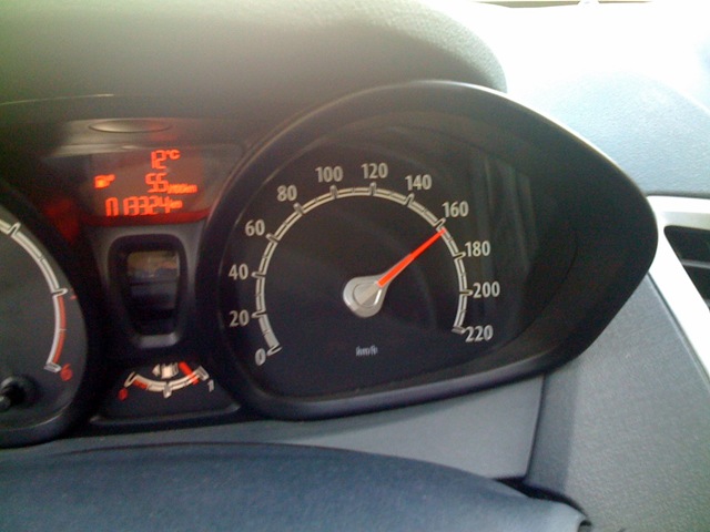 Il a bien fallu que j’essaie… Bon, ça dit ~160 mais mon GPS me disait plutôt 155, la voiture est configurée plus basse qu’elle ne l’est réelement. Une Ford Fiesta, c’est pas vraiment fait pour la haute vitesse, mais ça tenait un peu la route encore avec quelques vibrations dans le volant.