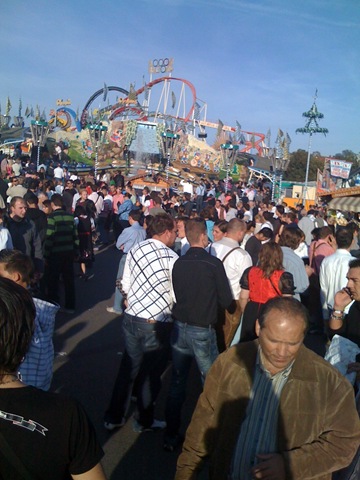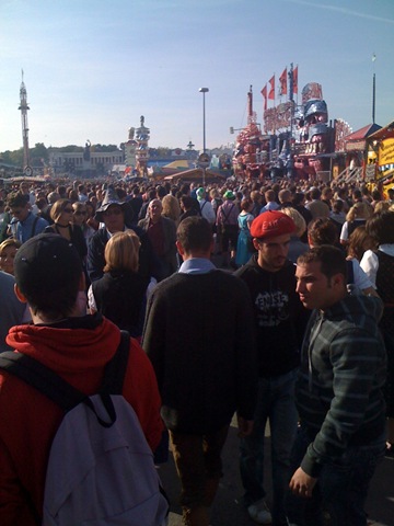 L’Oktoberfest, c’est comme ”La Ronde” à Montréal, mais avec beaucoup beaucoup beaucoup de monde partout, le site est nettoyé constamment mais est très sale quand même (bouteilles cassées par terre, substances douteuses, papiers, etc.), les poubelles débordent. Il faut faire attention où on marche.