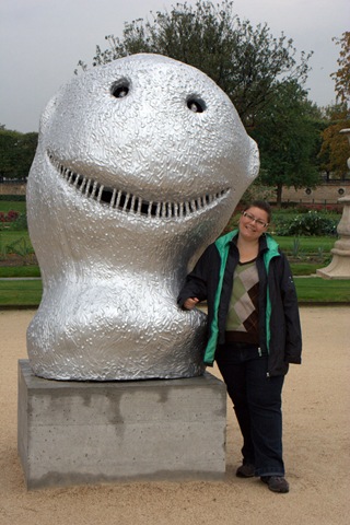 Il y avait quelques statues, une fontaine, des fleurs, et une grand et long espace tout en sable, avec presque personne. Pourquoi ? Parce qu’il pleut. Certaines statues (dont celles du même style que celle où Sarah pose) sont vraiment bizarres, mais bon. C’est drôle. On s’est pas trop attardé à savoir pourquoi elles sont comme ça, et il ne semble pas y avoir tant d’écritaux.